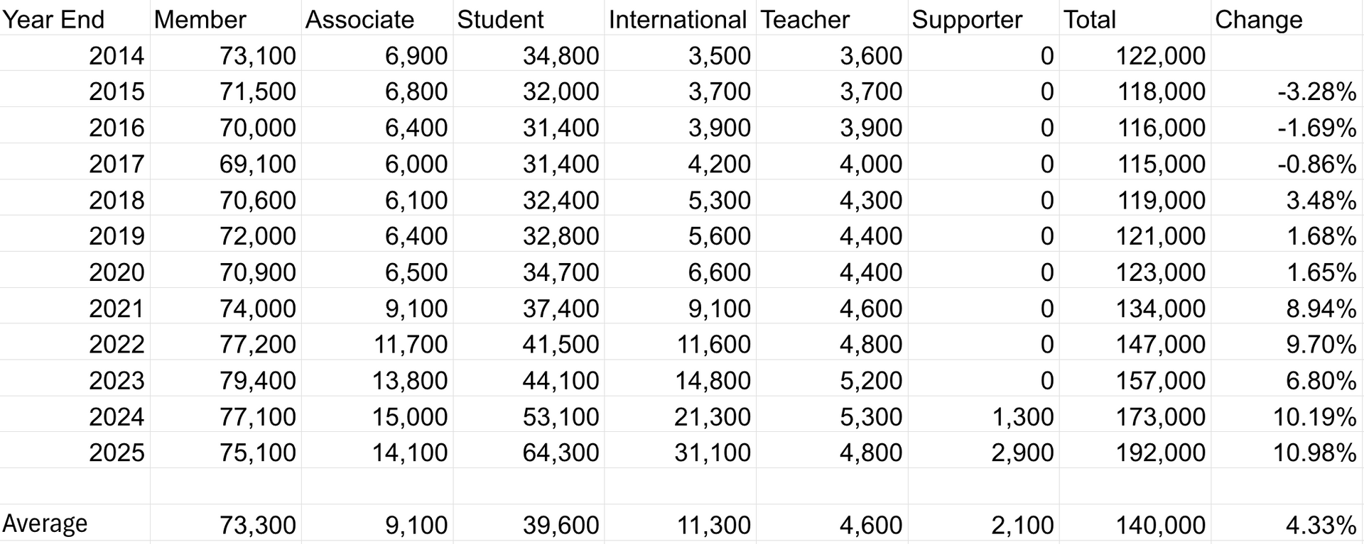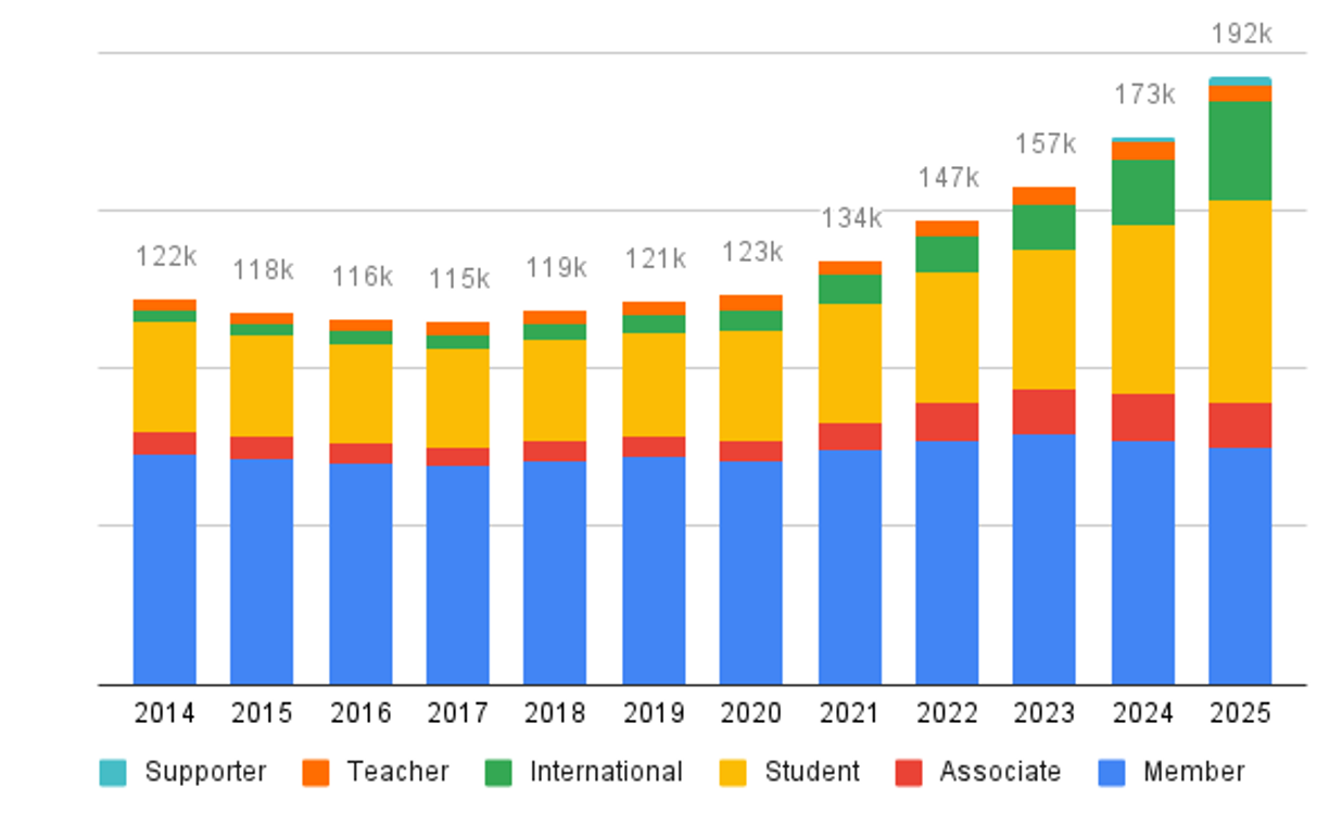 Membership continues to move towards a more diverse population. International membership has seen remarkable growth, increasing by 233% from 2021 to 2025. Membership is younger, as the median age of members continues to decline.