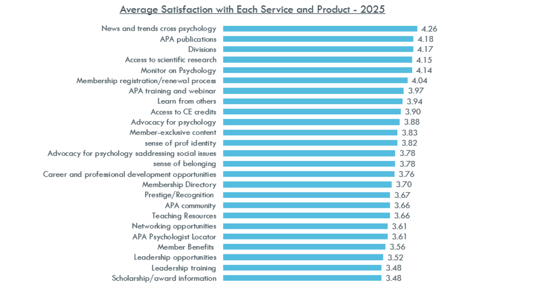 - Members are most satisfied with APA’s News and trends across psychology, APA publications, APA divisions, access to scientific research, and the